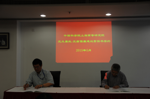 为深入推进中国科学院上海高等研究院(以下简称“高研院”)党风廉政建设和反腐败工作,严格贯彻执行党风廉政建设责任制,根据《中国共产党章程》、《中国科学院党风廉政建设责任制实施办法(暂行)》、《高研院党风廉政建设责任制实施细则(暂行)》规定,5月19日下午,高研院召开了党风廉政/反腐倡廉建设责任书签约仪式,院领导、职能部门负责人、科研中心主任约30人参加。