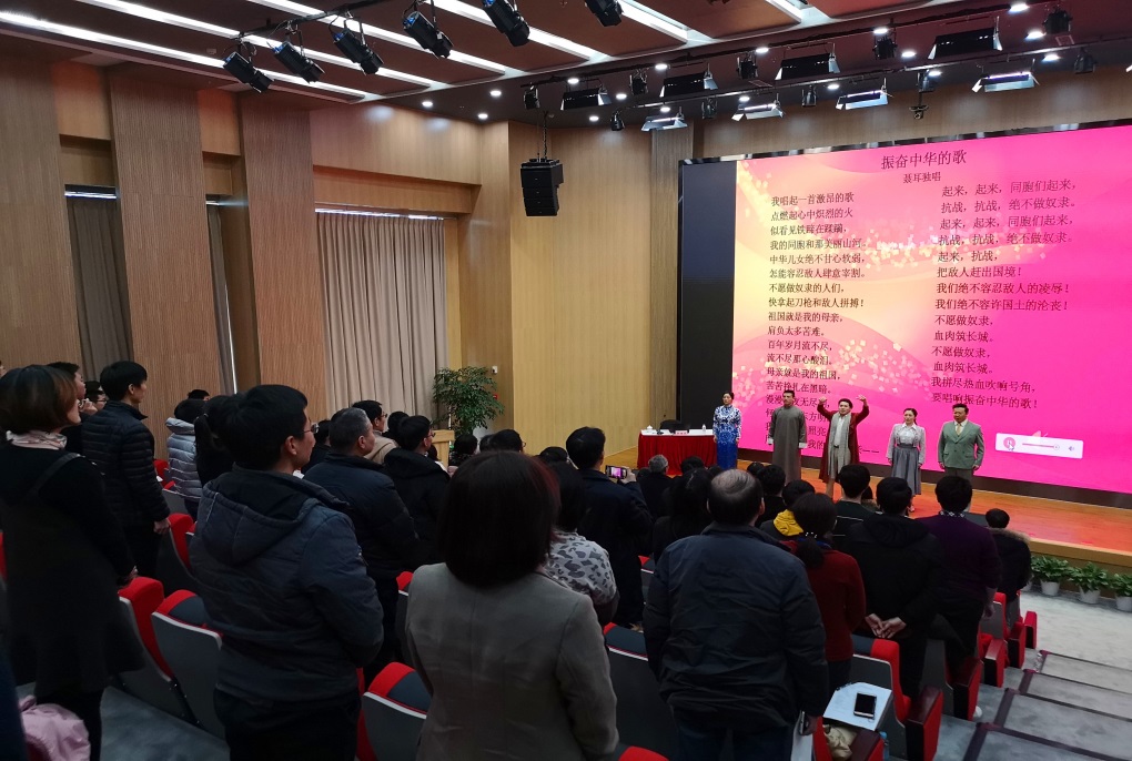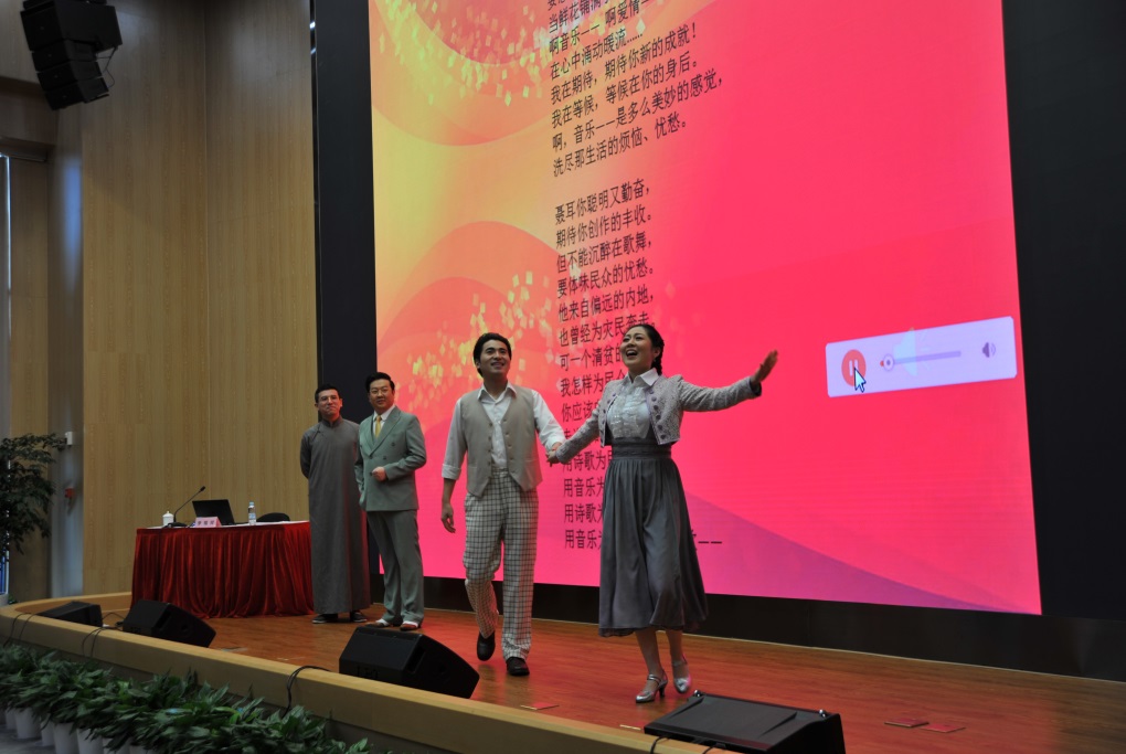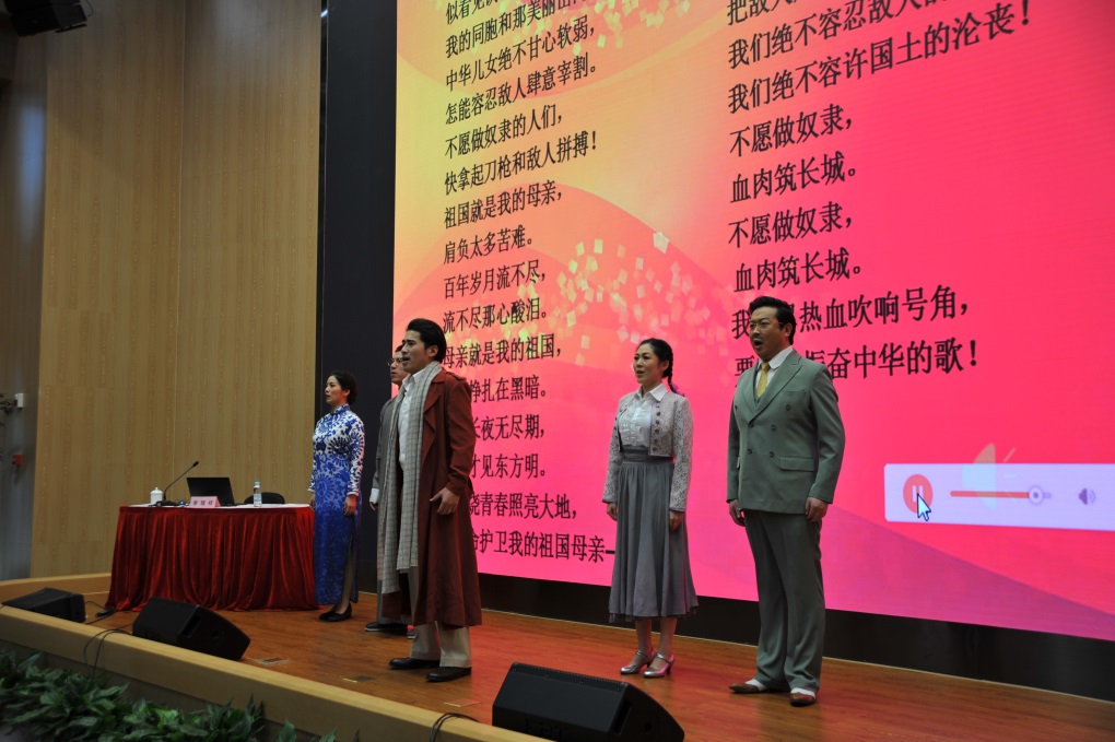 李瑞祥以“青春激扬国歌嘹亮”为题对国歌暨音乐剧《国之当歌》进行了导赏。讲座结合专业表演,带动在座党员同志在韵律的海洋中感受了别样的红色之旅。精彩的音乐剧表演让大家感受了人民音乐家聂耳与左翼戏剧家田汉从相识到相知直至共同创作《义勇军进行曲》的故事。《国之当歌》团队现场演绎了《天才的陨落》、《爱的涟漪》、《血肉长城》等数首歌曲,生动传神,具有很强的感染力。聂耳的咏叹调《振奋中华的歌》更是将聂耳面对山河破碎的痛苦与悲愤尽情倾泻,顺理成章地引出了《义勇军进行曲》的嘹亮旋律和铿锵音符,引起与会党员情感的强烈共鸣。参会人员与台上演员共同高歌,把此次音乐之旅推向了高潮,大家在歌声中接受了一次思想教育的深刻洗礼。