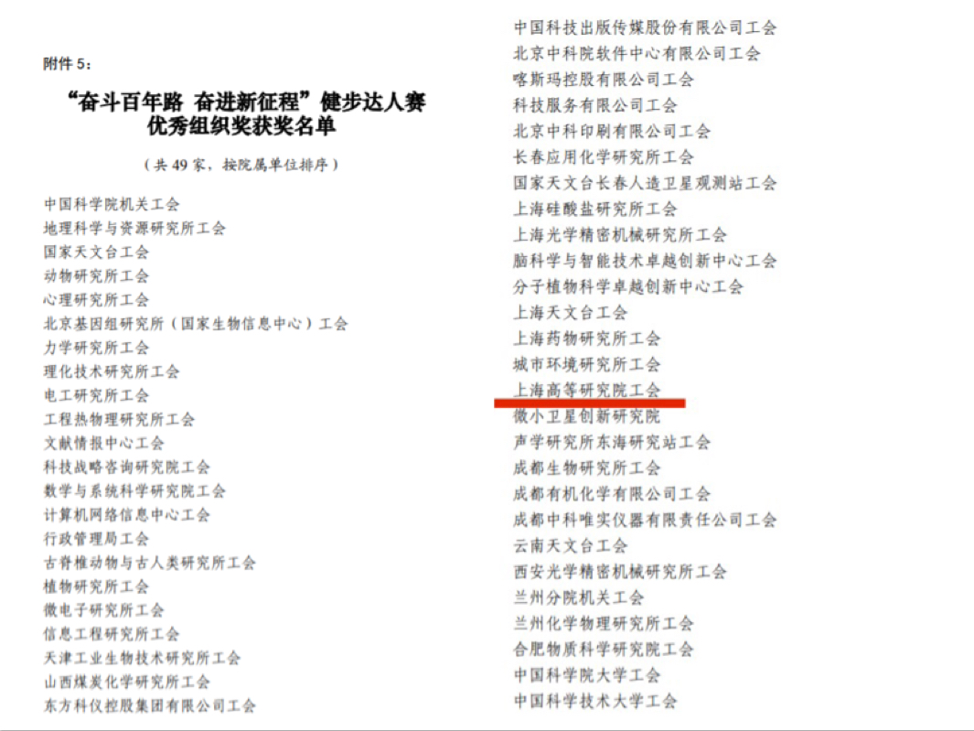 为庆祝中国共产党成立100周年,全面贯彻落实全民健身国家战略,中国科学院工会、体协结合党史学习教育,举办了为期100天的“奋斗百年路 奋进新征程”线上健步达人赛。高研院工会荣获优秀组织奖。