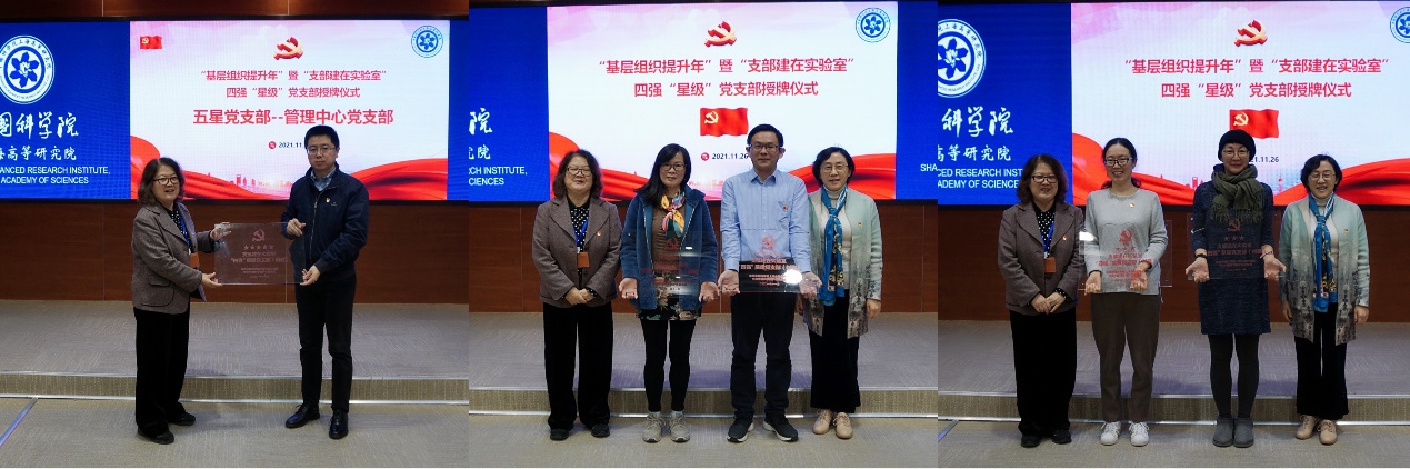 结合分院分党组、沪区党委“星级”党支部创建工作,李燕为获评“星级”的大科学装置管理中心党支部、绿色化学党支部、物理与材料党支部、研究生第一党支部以及蛋白质设施党支部授牌,以此激励“星级”支部发挥先进示范作用,促进各支部之间开展比学赶帮、你争我赶的氛围,不断提升党支部的党建工作质量和成效。