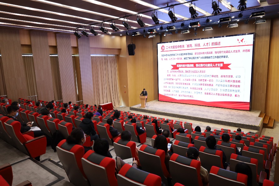 李儒新结合党的二十大参会感受,阐述了党的二十大报告的主题、要义和重点等,着重分析了“科技、教育、人才”战略地位的演进、科技创新体系、创新驱动发展和科教兴国战略,深入全面的向与会人员传达了党的二十大精神。李儒新表示,党员干部要原原本本学习研读党的二十大报告原文,深刻理解党的二十大对全面建设社会主义现代化国家作出的战略部署,尤其是创新在我国现代化建设全局中的核心地位。他指出,党的二十大报告将“实施科教兴国战略,强化现代化建设人才支撑”单独列出,把教育、科技、人才提到了“全面建设社会主义现代化国家的基础性、战略性支撑”的重要地位,体现了新时代新征程赋予广大科技工作者新的要求。我们作为国家科技战略力量主力军,必须正视科技创新已经成为百年变局中的关键变量,务必勇担科教兴国新使命,只有不断创新发展,抢占科技制高点,才能赢得战略主动。要在学思悟践中牢记使命,在知行合一中主动担当作为,努力为高水平科技自立自强和高水平人才高地建设作出贡献。