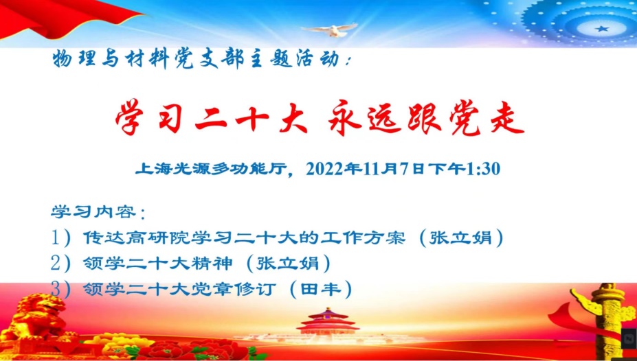 根据高研院党委《关于认真学习宣传贯彻党的二十大精神工作方案》,结合“我是党员、我履职、我发挥作用”主题活动,物理与材料党支部于11月7日组织召开“学习二十大,永远跟党走”主题党日活动。会议由支部书记张立娟主持,全体支部党员参加。