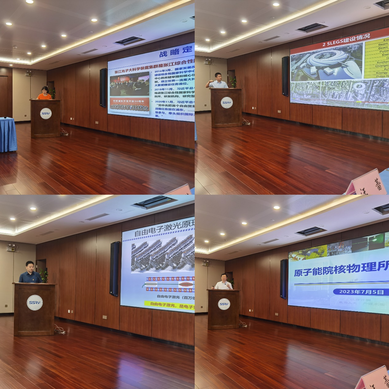 大科学装置管理中心党支部汪蕾、生命与成像党支部范功涛及物理与激光党支部谷端分别就张江大科学装置集群情况、上海光源SLEGS线站进展及自由电子激光装置进展等方面进行了报告交流。原子能研究院核物理研究所郭冰所长介绍了原子能院及核物理所的发展历程、科研动态及党建成果。双方就进一步在科学研究、大科学装置建设及管理、人才引进及党建交流方面的合作进行了热烈的沟通讨论。