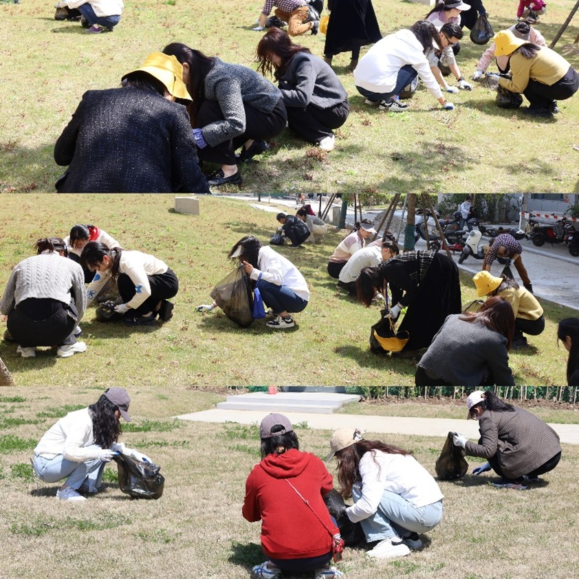 首期活动聚焦综合楼周边绿地和研究生宿舍楼前绿地,党员同志们共同协作,有条不紊地清除杂草、杂物,并将垃圾放至指定区域,园区环境焕然一新。