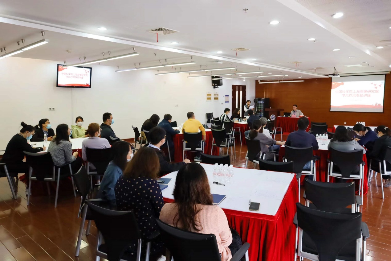 为进一步加强科研诚信和学风作风建设,弘扬科学家精神,筑牢思想道德防线,结合沪区纪委“送学上门”活动,10月14日上午,高研院组织开展了科研诚信与学风作风建设专题讲座,特邀上海市委党校(上海行政学院)科社教研部副主任上官酒瑞教授主讲。高研院党委书记、副院长李燕、纪委委员、纪检委员以及党员代表等近40人参会,会议由党委副书记、纪委书记唐铮主持。