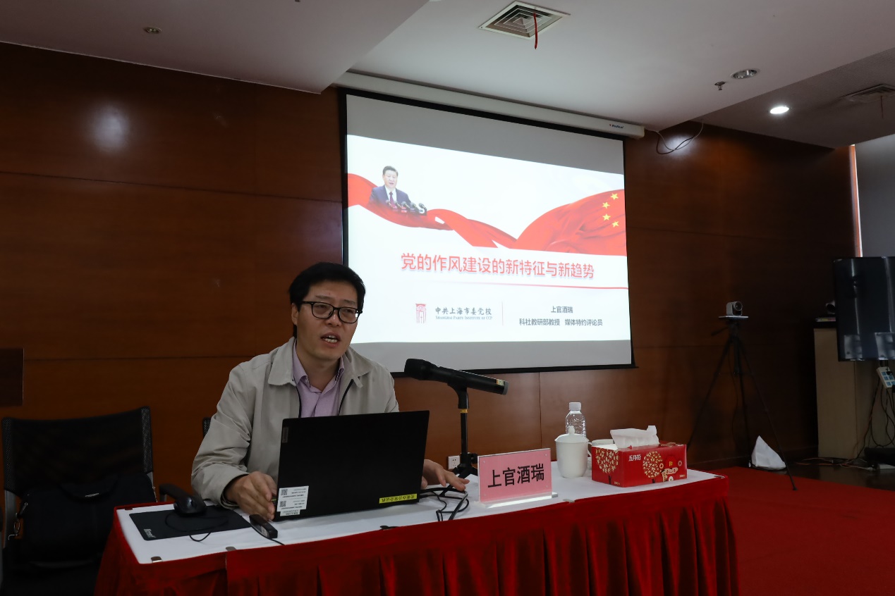 上官酒瑞教授以《党的作风建设的新特征与新趋势》为题,结合当前国内外形势,以深入浅出的语言,生动活泼的案例深刻阐释了在全新的历史环境下加强作风建设的内涵、必要性、重要性,以及如何守住守牢拒腐防变防线。