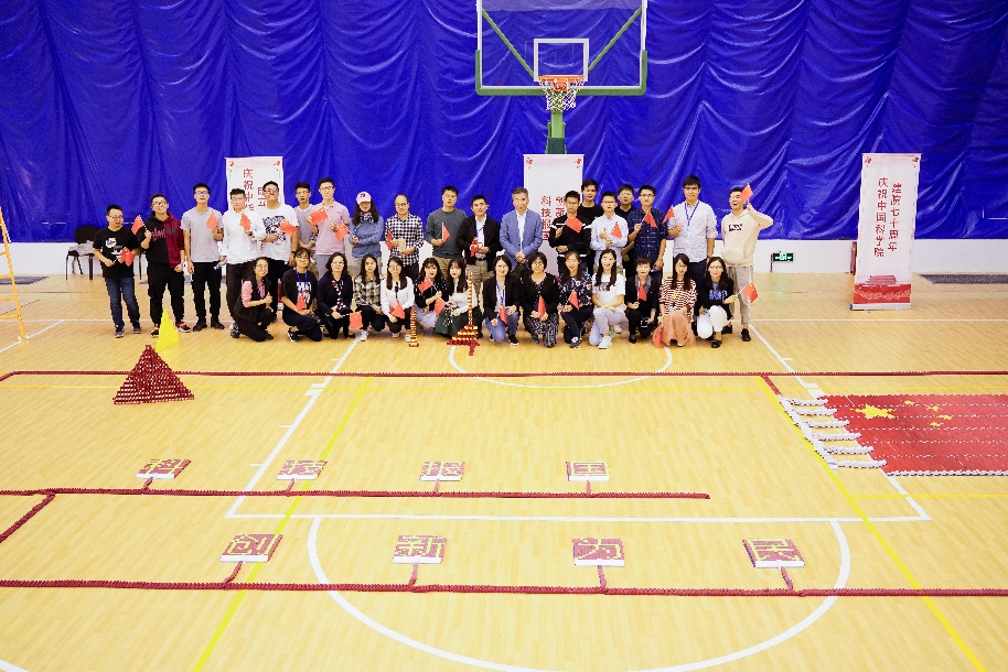 在多米诺骨牌展示环节,高研院党委书记朱志远与科研青年代表李东栋研究员、团员青年代表张斯颖共同启动触发机关,一幅40平方米的多米诺方阵缓慢呈现在众人面前。红黄两色的方阵书写“科技报国、创新为民”的坚定决心,用巨幅五星红旗为中华人民共和国成立70周年献礼。现场青年一同见证了多米诺骨牌的变化形成的生动壮观的画面,并为亲手完成的巨幅画卷欢呼雀跃。