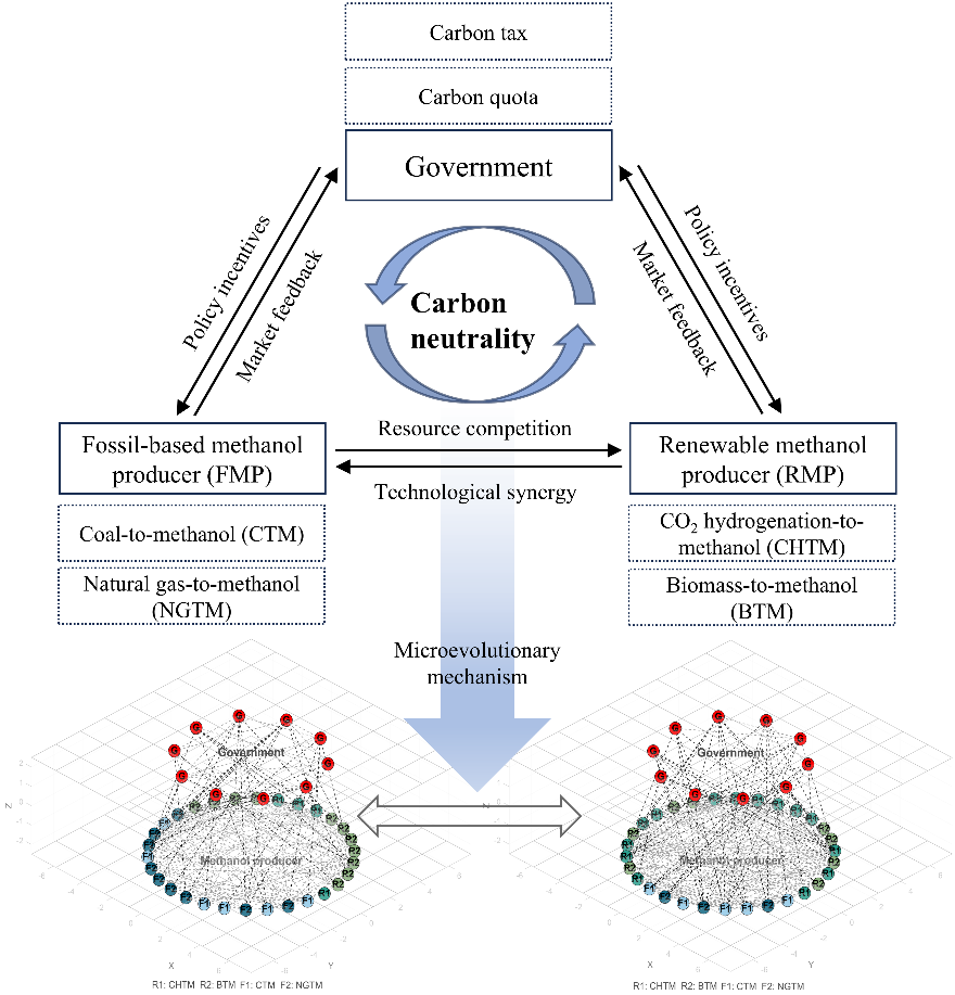 针对这一复杂问题,中国科学院上海高等研究院(以下简称“上海高研院”)“碳排放核算与碳捕集利用封存团队”提出了一种面向多主体决策的随机演化博弈精细化评估方法,系统刻画了政府、化石基甲醇生产商(FMP)与可再生甲醇生产商(RMP)之间的动态博弈关系,为甲醇产业低碳转型路径的量化分析提供了新工具。相关成果以“Methanol production technology development pathways under multi-agent stochastic evolutionary game: a complex network perspective”为题,发表于期刊《Energy》。