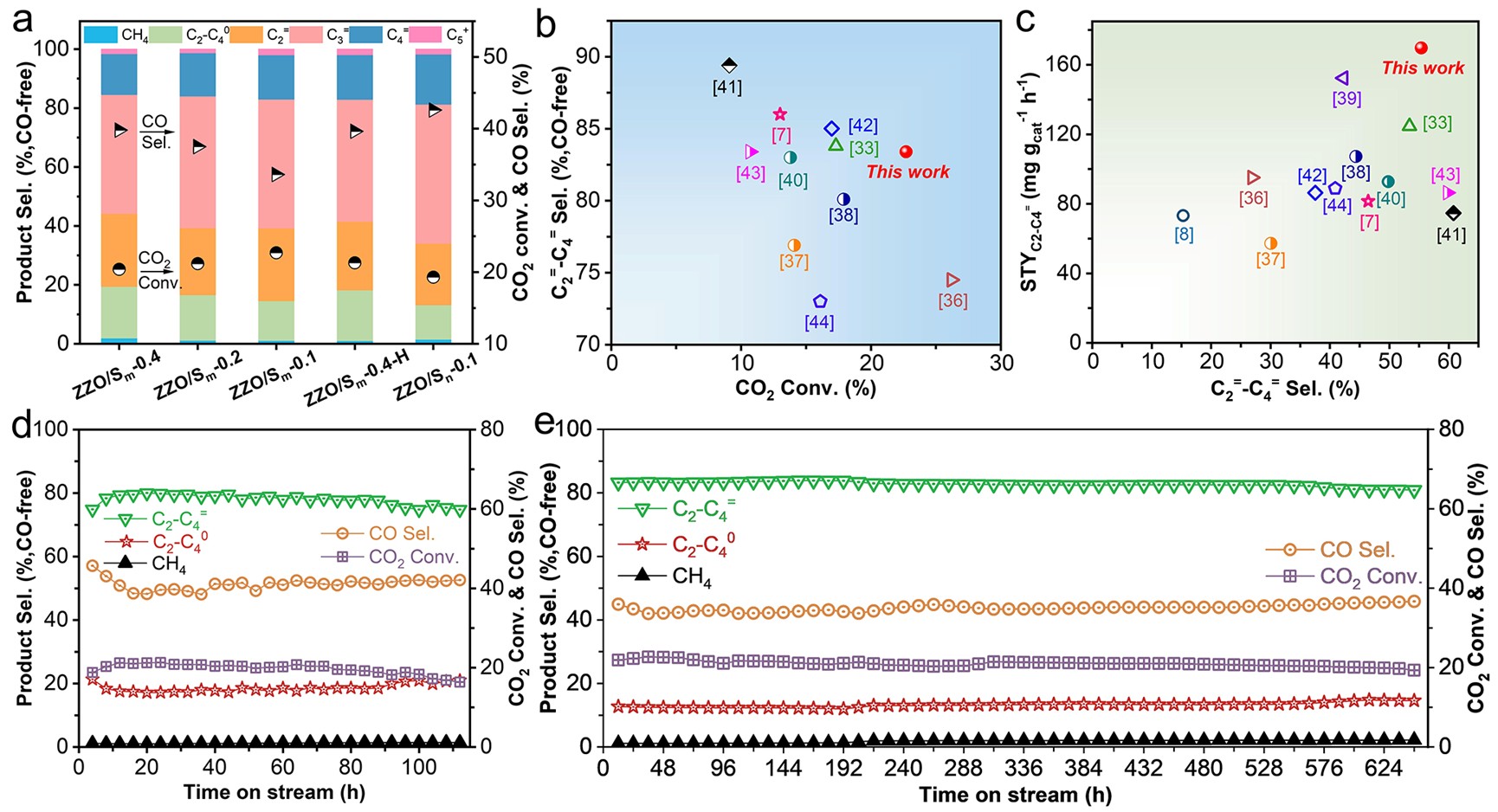 借助绿色氢气将CO2转化为化工生产的重要原料低碳烯烃(乙烯、丙烯、丁烯),不仅助力相关行业实现碳达峰,还将有力助推碳中和目标的实现,低碳烯烃通过进一步转化还可制备与石油基组成类似的航空燃料,是制备高品质可持续航空燃料的重要路线,因而备受国内外研究者的广泛关注。然而,CO2加氢制低碳烯烃高稳定性催化剂的构筑仍然是一个重大挑战。