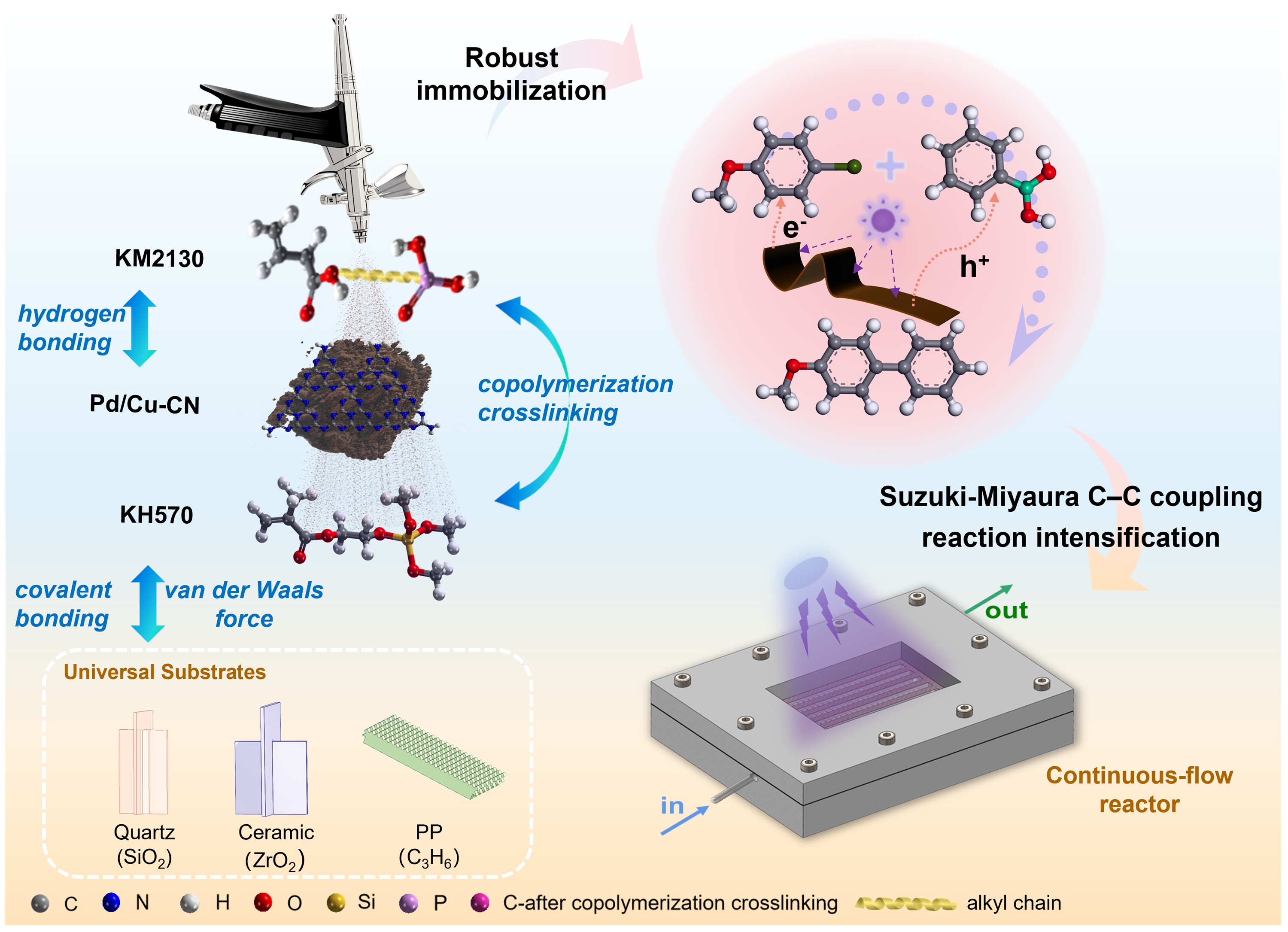 机制研究表明,该FCC涂层通过精巧的分子级设计,协同整合了氢键、共价交联以及界面锚定(共价键/范德华力)等多种相互作用力。这一“三重界面”机制使得Pd/Cu-CN光催化剂能够在极其温和的条件下,牢固附着于石英、陶瓷甚至聚丙烯(PP)塑料等多种材质表面,展现出极其优异的基材普适性。团队进一步将该固载技术与连续流微通道反应器深度融合。在优化光学与流体动力学参数后,该系统在经典的Suzuki-Miyaura C-C偶联反应中展现出颠覆性的催化效能: