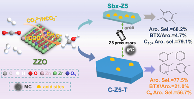 图1. 氧化物/分子筛耦合催化剂上CO2加氢制芳烃产物调控示意图