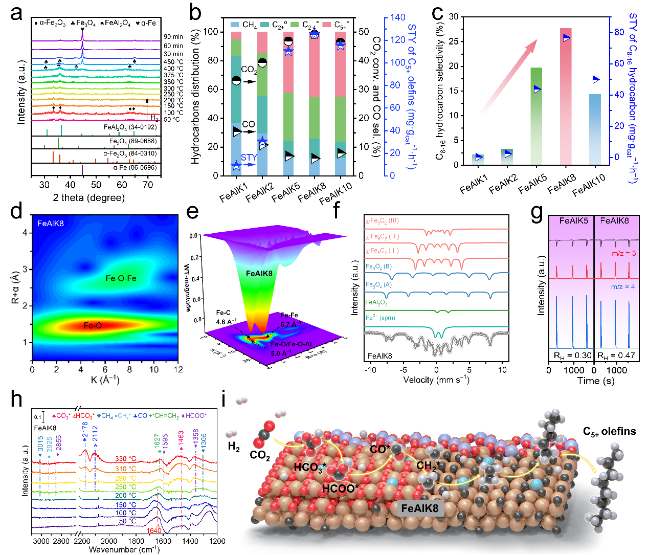 图1 FeAlK催化剂CO2加氢反应性能、多谱学表征及反应路径示意图
