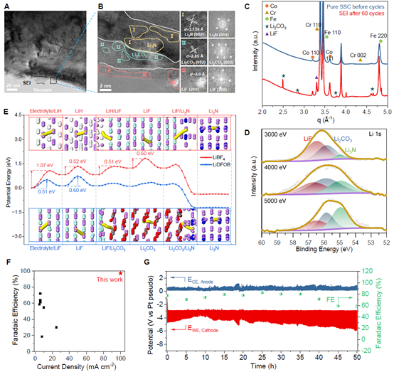 研究团队通过冷冻透射电镜结合同步辐射表征技术,解析出该DDLA由三层精确排布的无机相构成(图A-B):最外层为LiF层、中间层为Li2CO3离子传导通道以及最内层为与阴极接触的Li3N界面层(晶面间距分别为2.00 Å、2.85 Å和3.13 Å)。结构深度分析发现,DDLA中LiF表层通过低结合能特性加速锂离子去溶剂化,而Li2CO3中间层则形成三维离子渗透网络。基于同步辐射的宽能区HAXPES证实(图D):这种层次化结构在10-20纳米尺度上建立了连续的离子传输梯度。特别值得注意的是,DDLA内部发现的对称分布的Li3N晶畴与电解液界面形成分子级接触,为氮气还原提供了特异性活性位点。该结构特征解释了DDLA电极在高电流密度下实现高效锂介导氮还原合成氨的原理——Li2CO3通道将锂离子通量提升至常规均质SEI体系的100倍,同时LiF/ Li2CO3/Li3N异质界面显著抑制了析氢副反应。这些发现不仅揭示了电极-电解质界面离子传输的级联调控机制,其分级离子传输机制也为设计下一代高效合成氨电极提供了明确的界面工程原则。