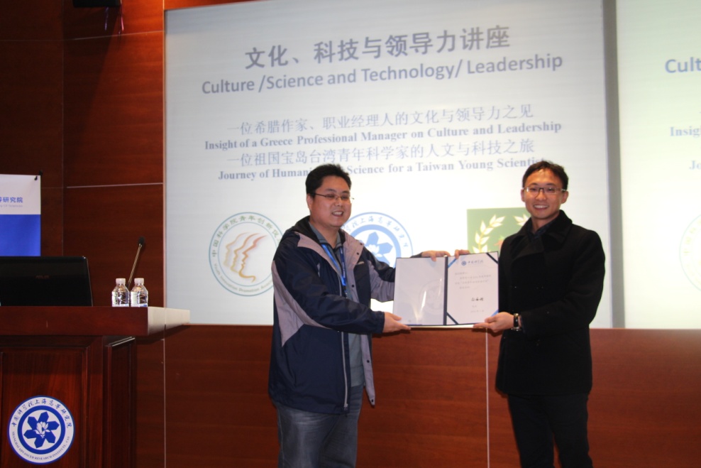 中科院上海高等研究院于2015年12月23日举办了“文化、科技与领导力”讲座。希腊作家、职业经理人Peter Alatsas与中科院台湾青年访问学者张培俊分别作了“文化与领导力”及“人文与科技之旅”的报告。该活动由上海高研院科技发展处、人力资源处、中国科学院青年创新促进会与青稞友邻社联合举办,高研院院长助理汪辉为张培俊颁发了“中科院台湾青年访问学者”证书并致辞,高研院及上海科技大学科研人员和研究生等50余人参加了此次活动。