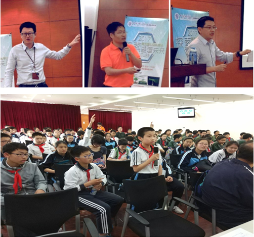 张晟宇、孙俊松及徐浩煜等一线科研工作者分别作了主题为“太空智能化-AI in space”、“CO2的生物固定与利用”及“基于虚拟现实的模拟飞行” 的科普报告,生动地讲述了什么是人工智能、空间机器人如何工作;面对人类生态环境日渐恶化,如何开展CO2转化工作;飞机的飞行原理、如何掌握基于VR的虚拟现实技术等学生们感兴趣的科学知识。现场互动环节将气氛引向高潮,答对问题的3个小观众受邀进入实验室现场体验了真正的虚拟现实的模拟飞行,收获满满。