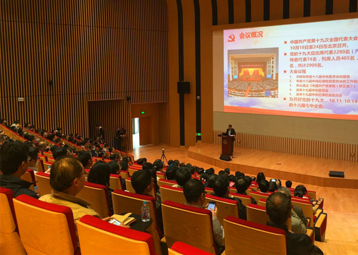 为认真学习和宣传贯彻党的十九大精神,上海高研院党委于10月30日下午,在上海科技大学报告厅举行了学习传达党的十九大精神报告会。会议由上海科技大学党委书记、上海高等研究院党委书记朱志远主持。高研院领导、两委委员、中层干部、党支部委员、正高级研究人员近70人参加了会议。上海光源、国家蛋白质科学中心、微小卫星创新研究院、上海科技大学约280人同时听取了报告。