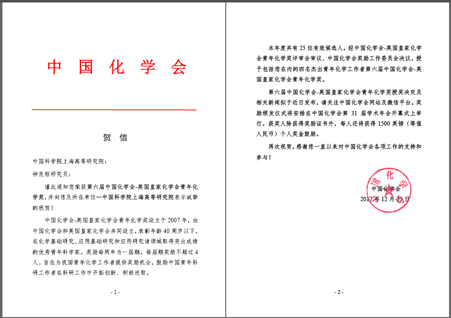 经中国化学会-英国皇家化学会青年化学奖评审会审议、中国化学会奖励工作委员会决议,上海高研院钟良枢研究员荣获第六届中国化学会-英国皇家化学会青年化学奖(此次共4名杰出青年化学工作者获奖)。
