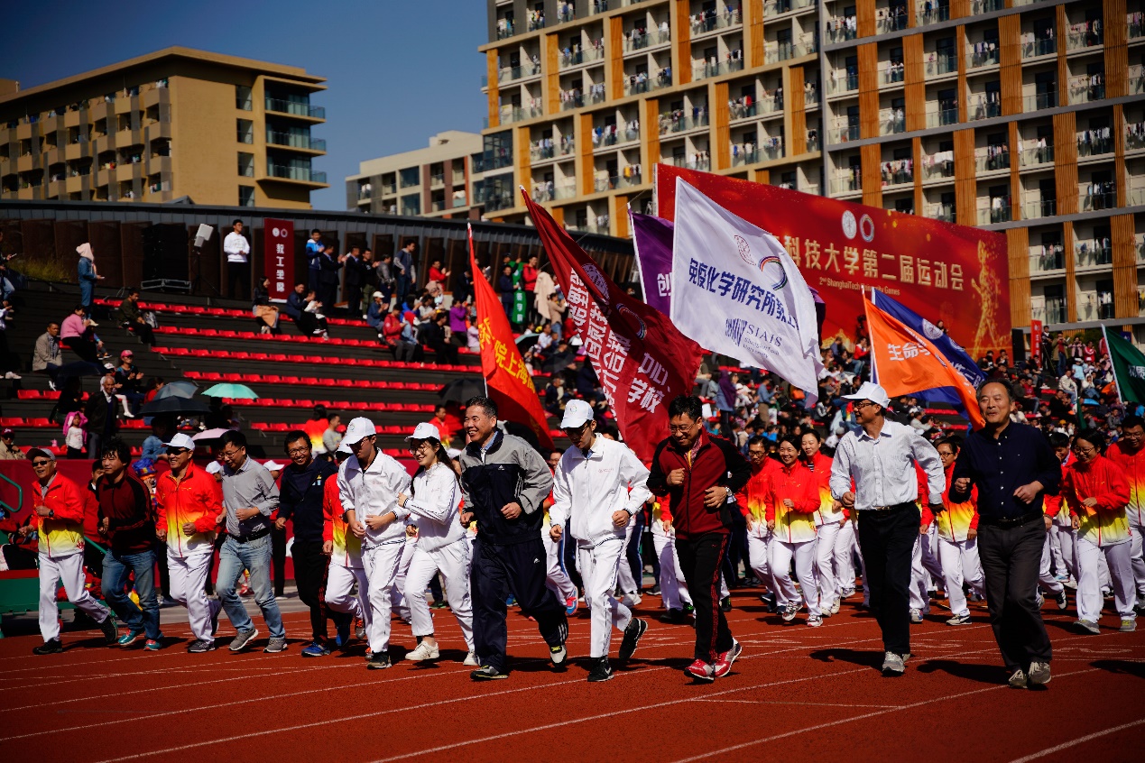 2018年10月27日,中科院上海高等研究院师生组成的运动员代表队参加了上海科技大学第二届运动会。高研院党委书记朱志远、副院长黄伟光、副院长王茂华、纪委书记唐铮出席了运动会开幕式。