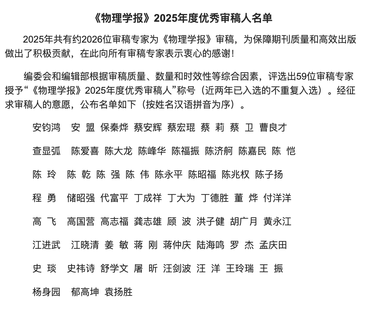 2025年共有2026位专家为《物理学报》审稿,编委会和编辑部根据审稿的客观公正性、质量、数量、审稿周期等因素综合考虑,评选出59位优秀审稿人,授予“2025年度优秀审稿人”荣誉称号。《物理学报》创刊于1933年,作为中国物理学领域的旗舰期刊,由中国物理学会和中国科学院物理研究所主办,是我国创刊最早、影响最广的物理类综合性中文期刊,也是唯一被SCI收录的中文物理学期刊。优秀审稿人的荣誉旨在感谢评审专家为“维护期刊质量和学术诚信”所做的宝贵贡献。